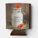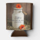 A can cooler which says: Life is better in the country. Designed with a rustic theme. A photograph of a white milk jug and a couple of orange flowers placed around the milk can. Sitting in a barn on some hay. Wooden panels in the background. Perfect for the cottage.