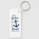 A stylish nautical themed 2 sided keychain with brush script and regal typography reading "Life is Better on the Boat" along with your family name, boat name or other desired text. This design features a classic boat anchor and five stars. Colours are classic navy blue on white or easily customise the base colour to your liking. Makes a great gift for any occasion.