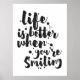 Inspirational poster displaying the phrase "Life is better when you're Smiling" in black brush script with an organic ink texture to achieve an authentic, hand lettered look. Designed to look great on all portrait orientated poster sizes. Please do check if the image needs to be repositioned or resized after changing the poster size.