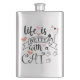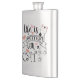 The product is a good size and came exactly as it was pictured. The lid is not attached to the flask, which could be dangerous on drunken nights... The print came out surprisingly well and looks very sharp. Would definitely recommend.