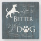 Protect your table and counter tops with a Life is better with a Dog Coaster. Coaster design features text that says "Life is better with a Dog" with a paw print and dog silhouette embellishment against a deep blue rustic wooden background. Additional gift items available with this design as well.
