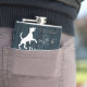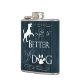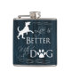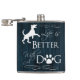 A perfect flask for those who find life much better with a dog in it. This flask design features text that says "Life is better with a Dog." with a paw print and dog silhouette embellishment against a deep blue rustic wooden background. Additional gift items available with this design as well.