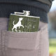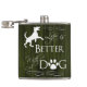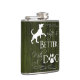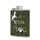 A perfect flask for those who find life much better with a dog in it. This flask design features text that says "Life is better with a Dog." with a paw print and dog silhouette embellishment against a deep green wooden background. Additional gift items available with this design as well.