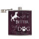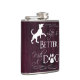 A perfect flask for those who find life much better with a dog in it. This flask design features text that says "Life is better with a Dog." with a paw print and dog silhouette embellishment against a deep magenta wooden background. Additional gift items available with this design as well.