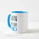 The mug is a classic white ceramic mug with a bright colour interior and handle. It features the text "FUN MODE ON" in bold, navy blue letters, with a playful on/off toggle switch graphic below the text. The overall design is clean and modern, with a touch of humour.
