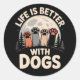 A heartwarming cartoon-style illustration featuring four adorable dog paws raised toward a glowing full moon. Surrounded by silhouettes of pine trees and set against a calm night sky, the artwork delivers a cozy, emotional message: “Life is Better With Dogs.”