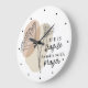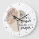 Wall clock depicts a simple floral line art design with two flowers on earth tone shapes. It features encouraging inspirational quote, "Life is fragile handle with prayer."