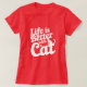 A white text graphic on a black background. The text reads "Life is Better with a Cat" in a stylized, cursive font. A small silhouette of a cat is positioned between the words "Better" and "with." This design is perfect for cat lovers and would look great on t-shirts, mugs, or other merchandise. The bold, white text stands out against the black background, making it easy to read and understand.