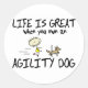 Gifts made just for agility dog owners, with a stick figure cartoon person running along with their little brown dog, who is leaping over a jump. Cute design reads Life is Great when you own an Agility Dog! Unique dog agility stickers.