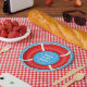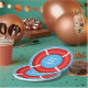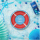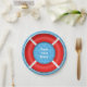 Red life preserver design on blue curley wave background to personalise for fun custom nautical themed party products.