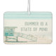 Emotive image of a lifeguard tower on white sandy beach with quote "Summer is a state of mind" on car air freshener with 'Island Breeze' scent.