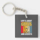 Hockey theme keychain with hockey puck and sticks with colourful stripes and text that Life's About Goals and Assists!