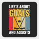 Hockey theme stickers with hockey puck and sticks with colourful stripes and text that Life's About Goals and Assists!