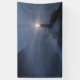 A lighthouse with a cross as the light shines out over the rocks and breakers of a mist-covered shore, showing incoming boats the way to safety.