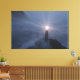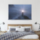 A lighthouse with a cross as the light shines out over the rocks and breakers of a mist-covered shore, showing incoming boats the way to safety.