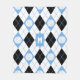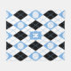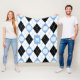 This sporty volleyball fleece blanket features a light blue, black and white argyle plaid pattern with light blue "stitching" extending diagonally across the diamond shapes and white volleyballs overlying the blue diamond shapes - customise with athlete's monogram - by katz_d_zynes