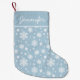 Elegant, personalised Christmas stocking featuring your name at the top in a white script font. The stocking features a pattern of white snowflakes that flow down the design with a light blue background. The design repeats on the back.