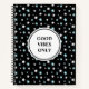 Light blue and white stars on navy blue. Good vibes text can be personalised.