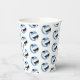 These volleyball themed birthday party paper cups feature multiple small light blue, black & white volleyballs arranged in a simple drop pattern - text on a white circle graphic can be customised, currently 12 to represent a child's age encircled by the words, "Happy birthday" - by katz_d_zynes