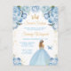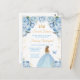 This elegant and glamourous sweet sixteen birthday invitation features a beautiful princess with blonde hair in a light blue ball gown. The text combines handwritten script and modern sans serif fonts for a classy and sophisticated look. The floral arrangements, butterfly and gold confetti create the perfect blend of rustic and chic.