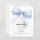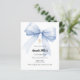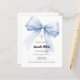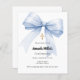A white background, decorated with a light blue large bow and a golden cross. Personalize and add a name and details details.