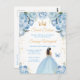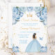 This elegant and glamourous sweet sixteen birthday invitation features a beautiful princess with brunette hair in a light blue ball gown. The text combines handwritten script and modern sans serif fonts for a classy and sophisticated look. The floral arrangements, butterfly and gold confetti create the perfect blend of rustic and chic.