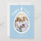 Personalizable photo template card designed for Easter by Destei. Your photo is placed inside an Easter egg shape with a white border and light blue dots. The top of the egg reads “Happy Easter,” separated by a cute bunny silhouette with space at the bottom for a name and year. The text appears in white on a light blue background and both colors can be changed if desired. On the back, a pattern of tiny Easter eggs creates a playful polka dot effect. A whimsical and festive design for sending Easter greetings.