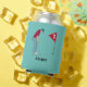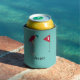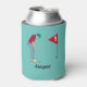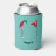 Pale blue/teal personalised golfer, wearing a cap, deep red shirt and blue pants, putting a golf ball into a hole can cooler.