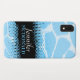 Bright teen style animal patterned case in black and blue hues. Personalise this item with your full name. This example currently reads: Jennifer Mcdonald. This original pattern by Sarah Trett, is based on the patterning found on a giraffe with a halftone moiré dot gain pattern overlay.