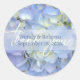 Light blue hydrangea personalised wedding stickers. Modern square shape with rounded corners has templates for easily adding names and wedding date in dark charcoal grey text.