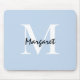 A light powder blue background, a white monogram and a script signature. an elegant girly trendy mouse pad.