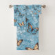 This is a towel set that has a light blue mosaic design and pattern that has butterflies.