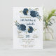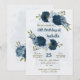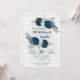 Beautiful romantic birthday party invitation featuring navy blue and light dusty blue flowers and some pretty leaves .