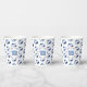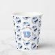 These volleyball birthday party paper cups feature multiple small light blue, navy blue & white volleyballs arranged in a simple drop pattern - text on a white circle graphic can be customised, currently 13 to represent a child's age encircled by the words, "Happy birthday" - by katz_d_zynes