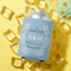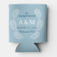 Perfect for a coastal wedding, engagement party or other event, this pale powder blue customised can cooler features easy to edit text in navy blue and white with text for a name, monogram letters, date and location surrounded by a wreath of illustrated, line art, white oyster shells to add a bit of coastal flair to showers, wedding receptions and more.
