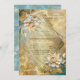 A light blue palette is in front of a copper/bronze Barogue-style background pattern. Cards are decorated with cream flowers and gold leaves over a diamond-shaped frame.