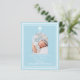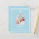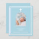 A light blue background, decorated with a white frame, and a white cross Personalise and add a photo name and details. White text. Arch shaped photo frame.