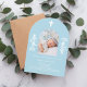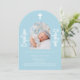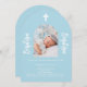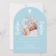 A light blue background, decorated with a white cross Personalise and add a photo name and details. White text. Arch shaped photo frame.
