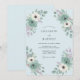 This botanical design features a serene palette of light blue and sage green, accented by delicate lavender sprigs. Hand-painted watercolor anemones and roses create a romantic arrangement around the layout. The aesthetic is perfect for a spring event, emphasising natural beauty and a soft, airy atmosphere.