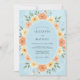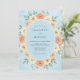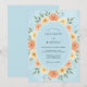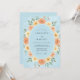 This design features a soft light blue backdrop adorned with a lush arrangement of watercolor peach roses and sunny yellow wildflowers. Verdant green foliage and delicate sprigs weave through the floral display to create a bright and airy atmosphere. The colour palette of pastel blue, warm orange, and gold evokes a cheerful spring mood.