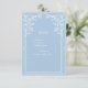 This wedding RSVP card exudes elegance and sophistication. The soft blue background provides a fresh, serene canvas that perfectly complements the intricate white floral patterns around the edges. Words are written in a modern, bold font, emphasising the importance of the event. The rest of the text is in a classic, graceful script, creating a harmonious contrast. Overall, this design beautifully blends modern typography with timeless elegance, making it ideal for any romantic wedding celebration.