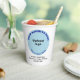 Customisable paper cup for your cafe business. You can put your business name on it. Customise it and use it like a marketing material to advertise your business or to promote your brand name. Build brand name awareness while your customers enjoy sipping the tasty and aromatic coffee that you served to them. Design and colours on the paper cup are dark blue texts on light blue round shape background and black colour business address and phone number texts. Contents are your business logo, business or company name, city or town, state, address and phone number.