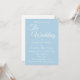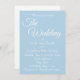 Simple style, wedding invitation that features a trendy, light blue colour background along with the future bride and groom names and event date, time, location, and registry printed in white, stylised script. Personalise your wedding invitation by replacing info with your own. Select your invitation paper style and quantity. Designed to coordinate with our Light Blue Simple Style Wedding collection.