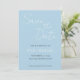 Simple style wedding save-the-date invitations that feature black, stylised script on a trendy, light blue colour background. Edit and replace names, date, and location with your own. Select your invitation size and paper style.