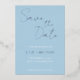 Simple, silver foil print wedding Save the Date card with white, stylised script on a trendy, light blue colour background. Edit names, date and location with your own wedding information. Change foil colour if desired. Background colour may be changed as well to match your wedding colour scheme.