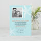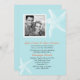 Starfish wedding announcement and reception only invitation. Add a picture of the newlyweds to this tropical themed invitation. Coral orange text for the names of the couple and type of party. All other text is black. Light blue cards have optional speciality paper upgrades and a choice of shapes.