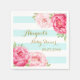 Baby Shower napkins in light pastel teal sky blue and white stripes with pink watercolor vintage flowers and gold colour text.