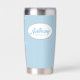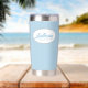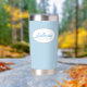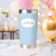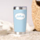 Gift your wedding groomsman with this personalised, stainless steel, thermal tumbler with his name in stylised script in a white oval design. Background and script is a trendy, light blue colour. Personalise your thermal tumbler by editing and replacing groomsman's name with desired name.