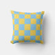 A vibrant light blue and yellow chequerboard pillow with a bold geometric style. Perfect for modern decor.