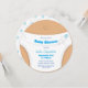 A baby shower invitation with a baby diaper on a light brown-skinned baby. The text and diaper safety pin are blue. All of the text is customisable. The background skin tone can be customised.
